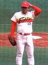 | 優勝請負人 | 日本ハムへの移籍1年目の1981年、リリーフエースとしてチ ームの19年ぶりの優勝に大きく貢献し、シーズンMVPに輝 く。両リーグでのMVP受賞は、プロ野球史上初めてのことで あった。広島時代の1979年から1983年まで5年連続で最多 セーブ投手のタイトルを獲得し、同時期、12球団全てからセ ーブを挙げる史上初の記録も作り上げた。まさに優勝請負人 であった。 |